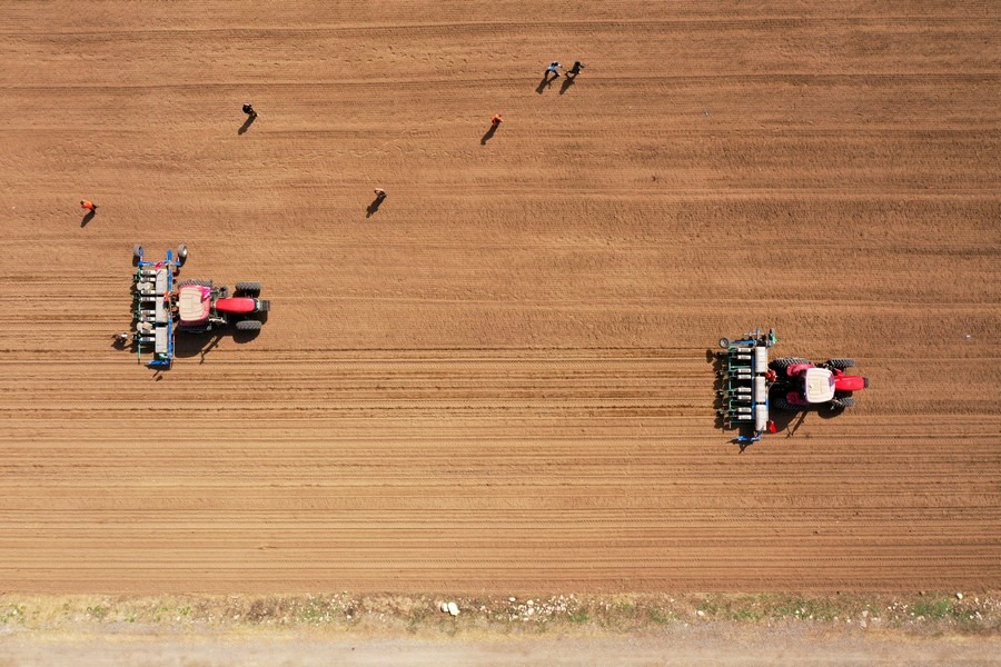 空中俯瞰自動導(dǎo)航無人駕駛農(nóng)機具 北疆新聞記者 張楊攝影