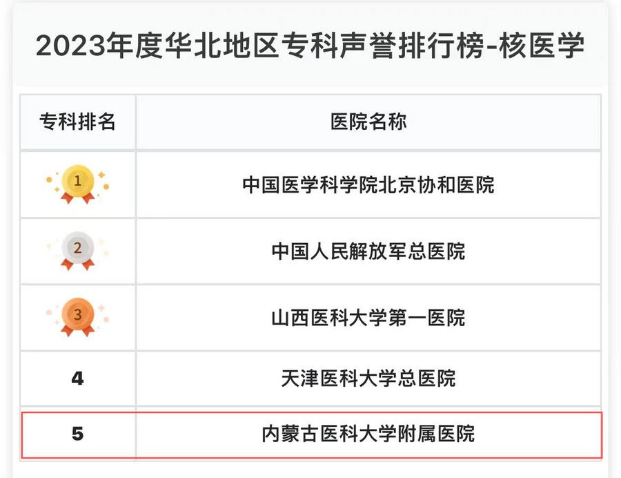 內(nèi)蒙古醫(yī)科大學(xué)附屬醫(yī)院核醫(yī)學(xué)科位列華北區(qū)第五,神經(jīng)外科、婦產(chǎn)科、風(fēng)濕科、重癥醫(yī)學(xué)、眼科、消化科、生殖醫(yī)學(xué)、腎臟病、皮膚科、內(nèi)分泌科、麻醉科、老年醫(yī)學(xué)、口腔科、檢驗醫(yī)學(xué)、急診醫(yī)學(xué)、變態(tài)反應(yīng)、疼痛學(xué)、罕見病、耳鼻喉科、健康管理、血液科、整形外科等22個??偏@提名,是內(nèi)蒙古自治區(qū)在此榜單獲前五和提名??谱疃嗟尼t(yī)院。