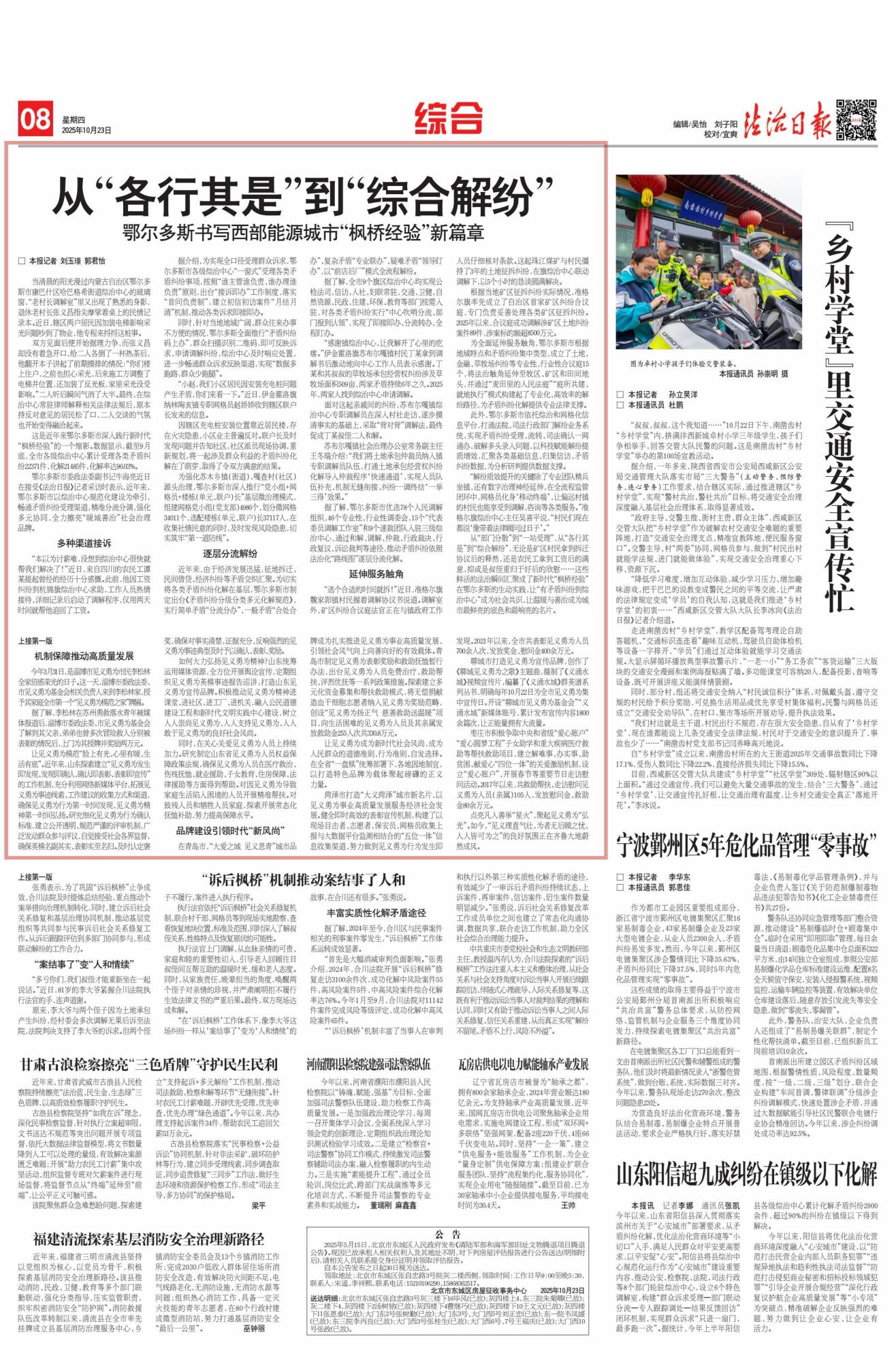 2025年10月23日,《法治日?qǐng)?bào)》第8版刊發(fā)題為《從“各行其是”到“綜合解紛”鄂爾多斯書(shū)寫(xiě)西部能源城市“楓橋經(jīng)驗(yàn)”新篇章》的文章,報(bào)道了鄂爾多斯市以綜治中心規(guī)范化建設(shè)為核心,深入踐行新時(shí)代“楓橋經(jīng)驗(yàn)”,通過(guò)多元舉措化解矛盾糾紛,全力打造“暖城善治”社會(huì)治理品牌。截至9月底,全市各級(jí)綜治中心累計(jì)受理各類矛盾糾紛22371件,化解率達(dá)96.03%。