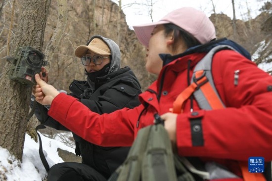 2月20日,在內(nèi)蒙古賀蘭山國家級自然保護(hù)區(qū),工作人員阿麗瑪(左)和徐皓在布設(shè)紅外相機(jī)。