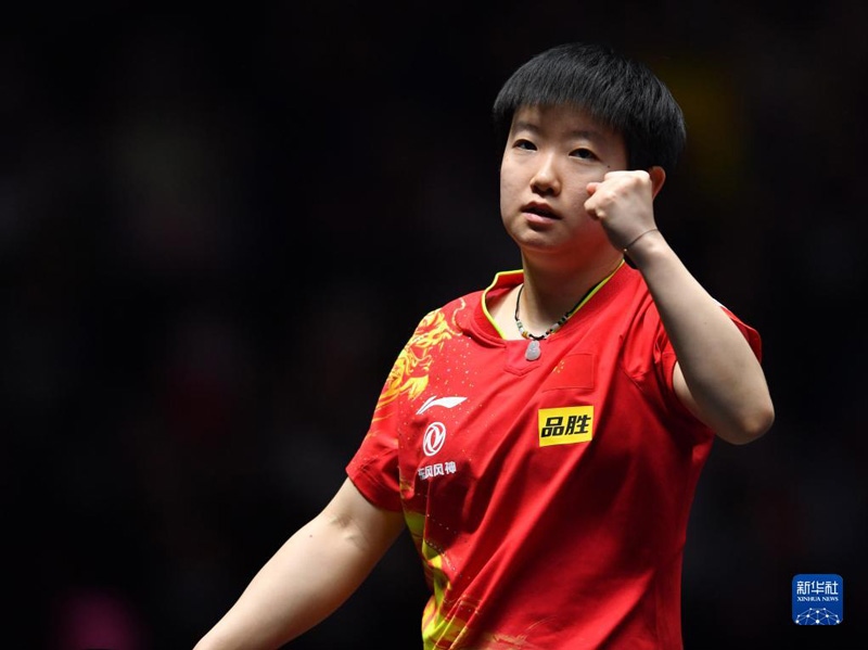2023年4月15日,孫穎莎慶祝比賽獲勝。當(dāng)日,在河南新鄉(xiāng)舉行的世界乒乓球職業(yè)大聯(lián)盟(WTT)新鄉(xiāng)冠軍賽女單決賽中,中國(guó)選手孫穎莎以4比1戰(zhàn)勝隊(duì)友王藝迪,奪得冠軍。新華社記者 李嘉南攝