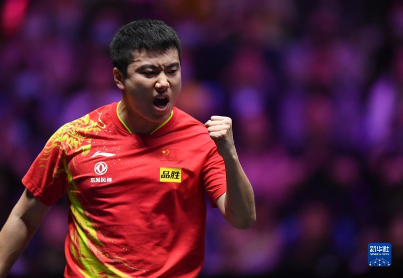 2023年4月22日,馬龍?jiān)诒荣愔?。?dāng)日,在澳門塔石體育館舉行的2023世界乒乓球職業(yè)大聯(lián)盟(WTT)澳門冠軍賽男子單打半決賽中,中國(guó)選手馬龍以4比1戰(zhàn)勝法國(guó)選手艾利克斯·勒布倫,晉級(jí)決賽。新華社記者 張金加攝